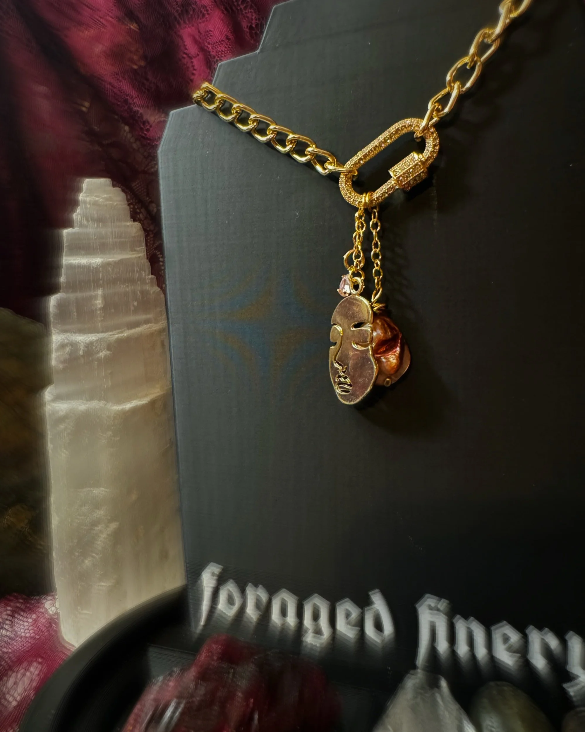 Shop Foraged Finery › Gold Carabiner Charm Pendant Necklace - Cool n Collected Collection Image 1 of 1 Gold Carabiner Charm Pendant Necklace - Cool n Collected Collection $30.00 Sold Out Gold carabiner charm featuring 3 non-interchangeable charmspearlgemstoneface Sold Out Added! Gold carabiner charm featuring 3 non-interchangeable charmspearlgemstoneface